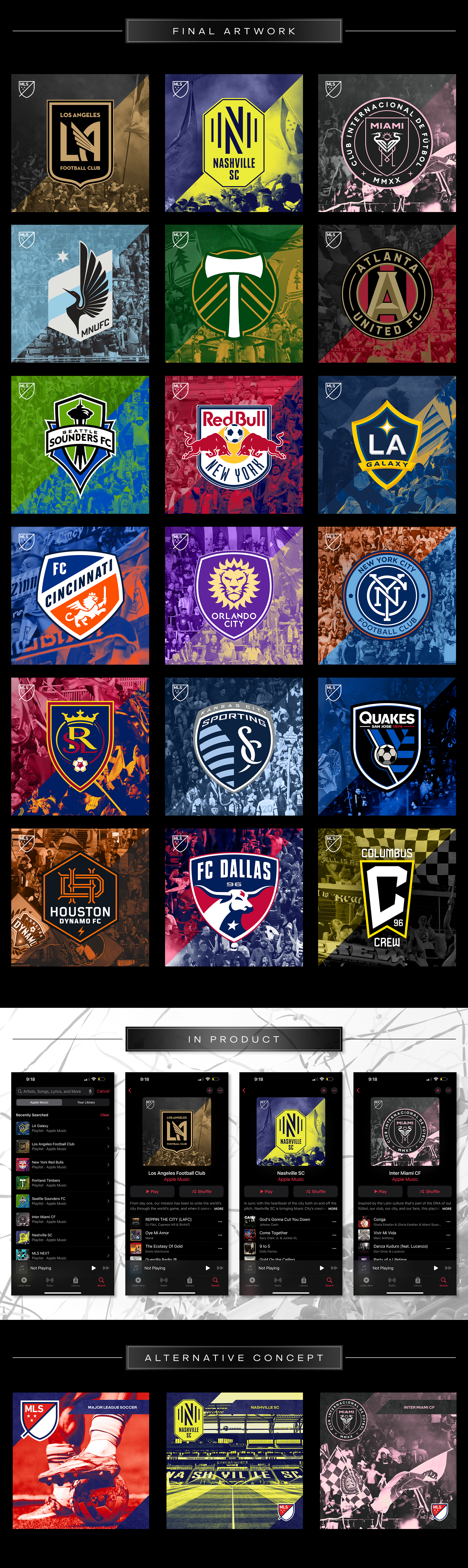 Thumbnail artwork created for MLS clubs on Apple Music as part of the 2023 Season Pass launch. Each club received a bespoke playlist that lived within a larger MLS hub on Apple Music, giving fans a new way to engage with their team. Below is the custom artwork for all 30 MLS clubs.